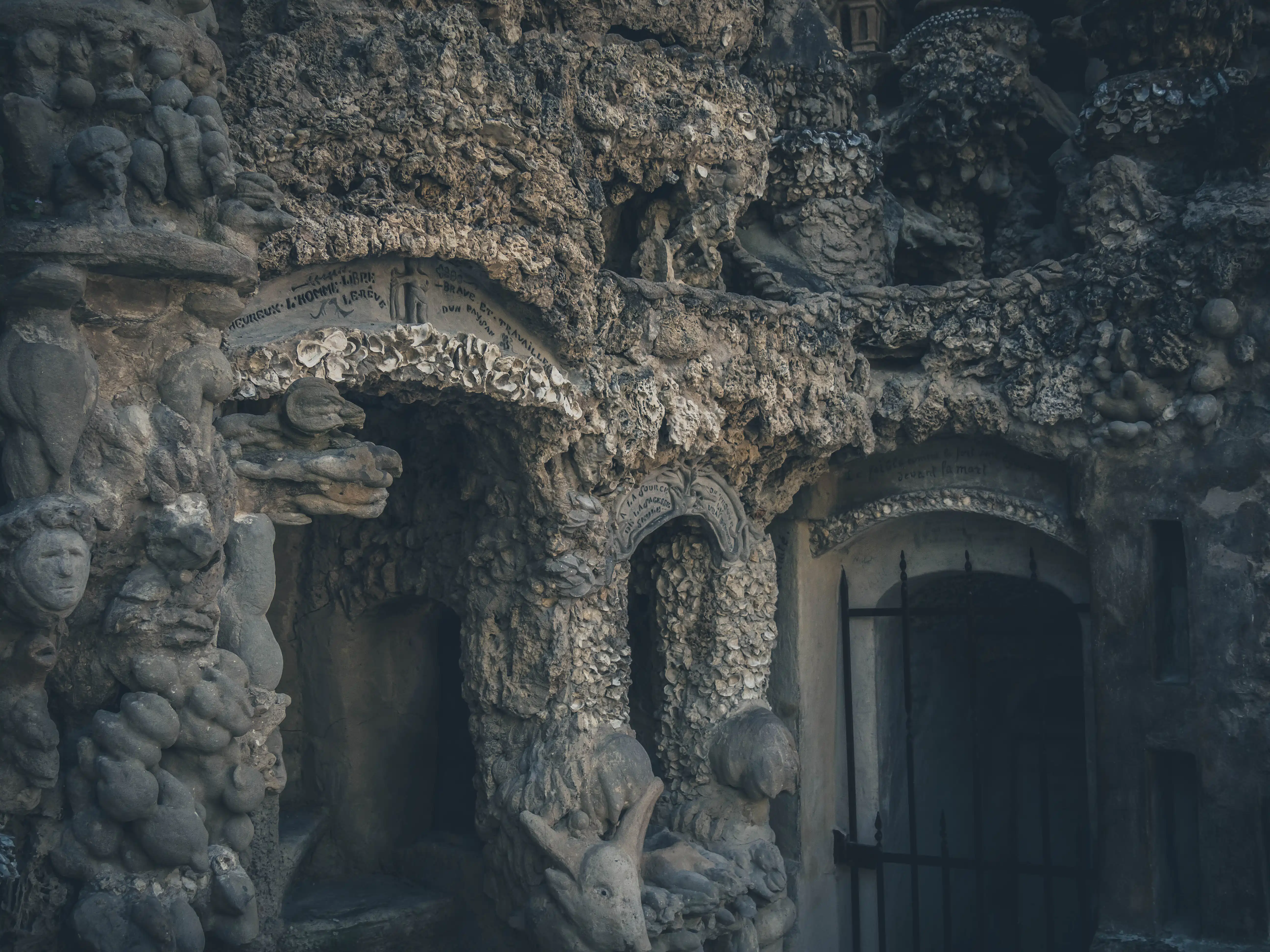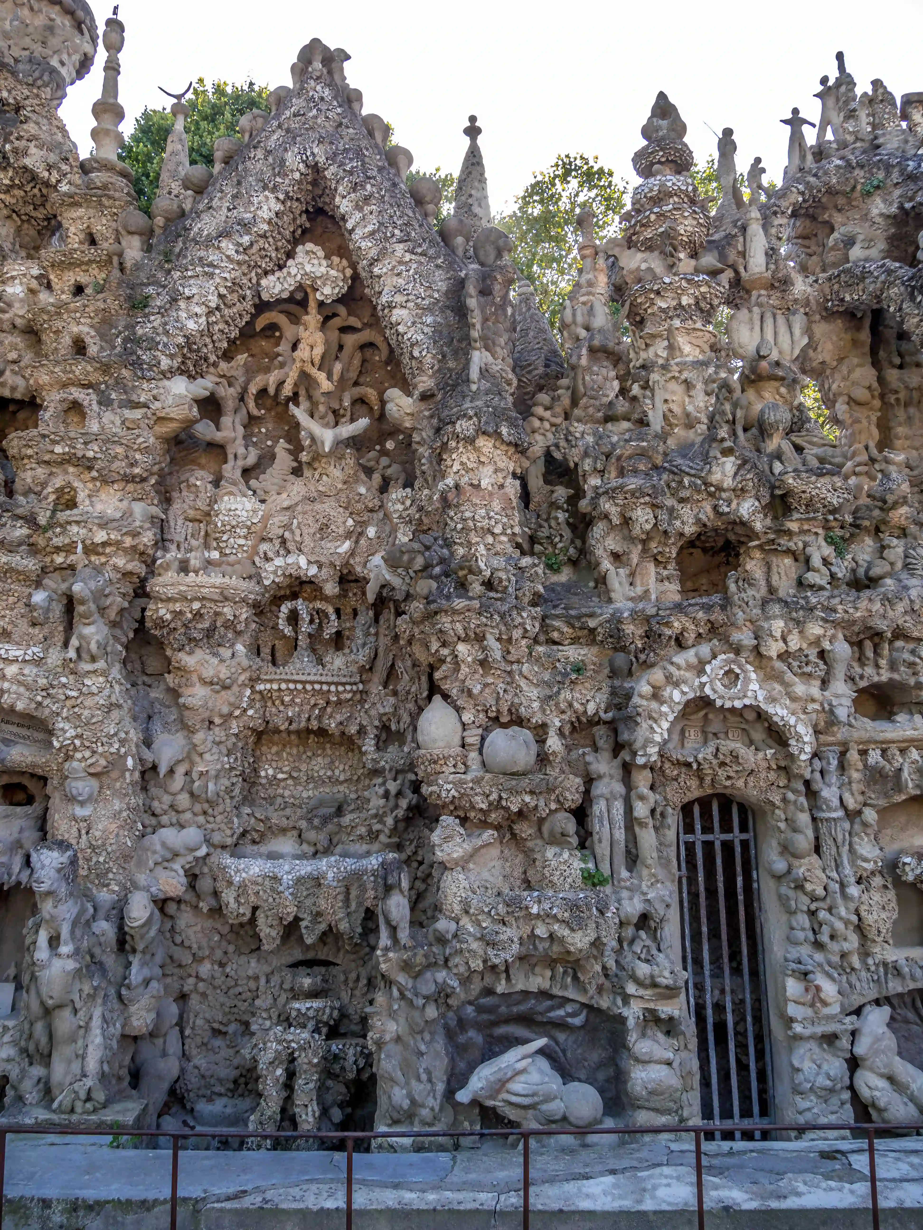 Imagine la Bible, un bol de mythologie hindoue, 2-3 dieux égyptiens à tête de lion ou de chouette et la déco intérieure de Godefroy de Montmirail. C’est bon ? T’es à mi-chemin de la réalité. Le palais mesure 12 mètres de haut et 26 mètres de long. Il est construit principalement à partir de pierres ramassées à la main, assemblées avec de la chaux, du mortier, du ciment et des armatures métalliques. Sa construction préfigure les techniques modernes de béton armé (c’est Wikipédia qui me l’a dit).