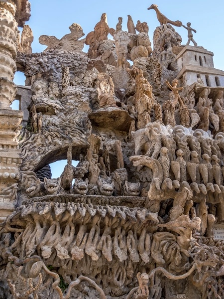 Le facteur Cheval a mis tout ce qui lui passait par la tête dans son palais. Des animaux exotiques, des géants, des fées, des styles d’architecture de tous les continents et même des citations trop longues qui se terminent en pattes de mouche par manque de place. L’ensemble forme un jardin luxuriant et un palais imaginaire, rendant hommage à la créativité sans limites de l’esprit humain.
